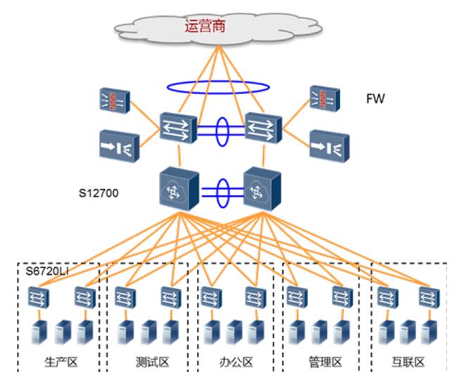 如下图,采用S12700系列敏捷交换机作为数据中心核心,通过集成的防火墙、负载均衡等多业务板